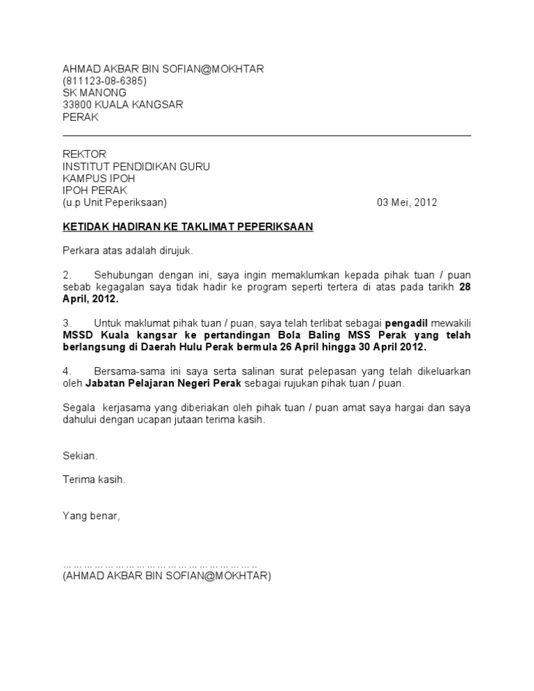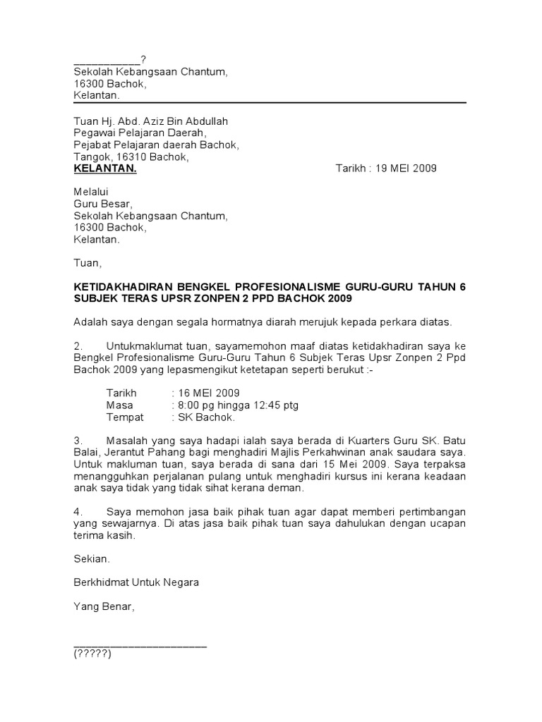 Contoh Surat Tunjuk Sebab Tidak Hadir Kursus Word Letter 7saudara Com